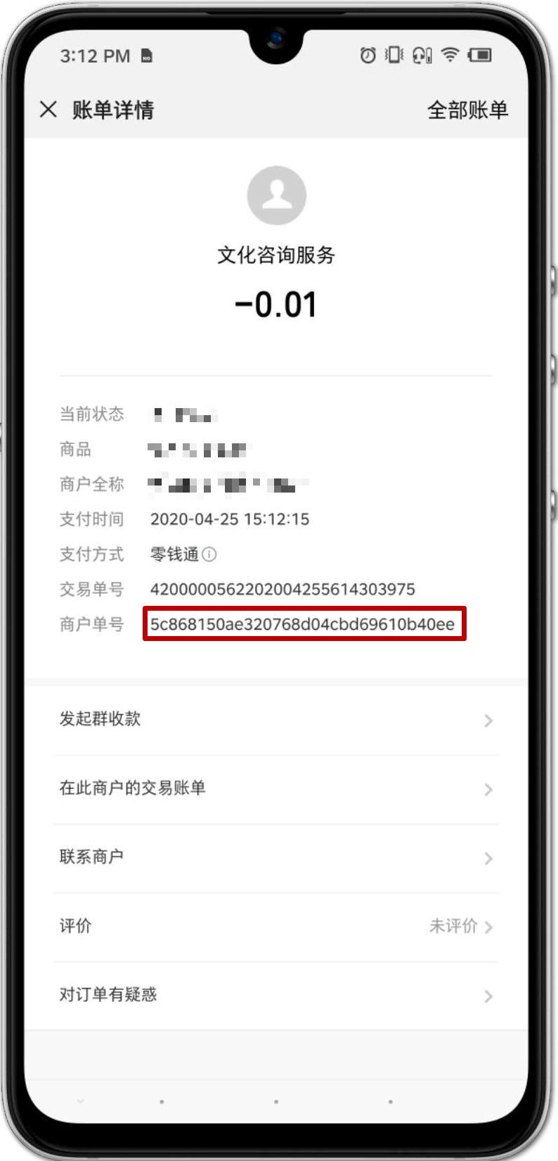 打开微信支付,点击查看相应订单详情,输入商户单号进行找回操作